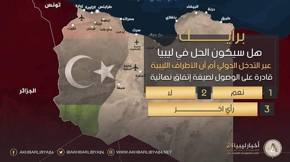 من هذا المنطلق طرحت أخبار ليبيا 24 سؤال على متابعيها بشأن الملف الليبي وعلاقته بالتدخل الدولي في صيغة كانت ” برأيك هل سيكون الحل في ليبيا عبر التدخل الدولي أم أن الأطراف الليبية قادرة على الوصول لصيغة إتفاق نهائية”.